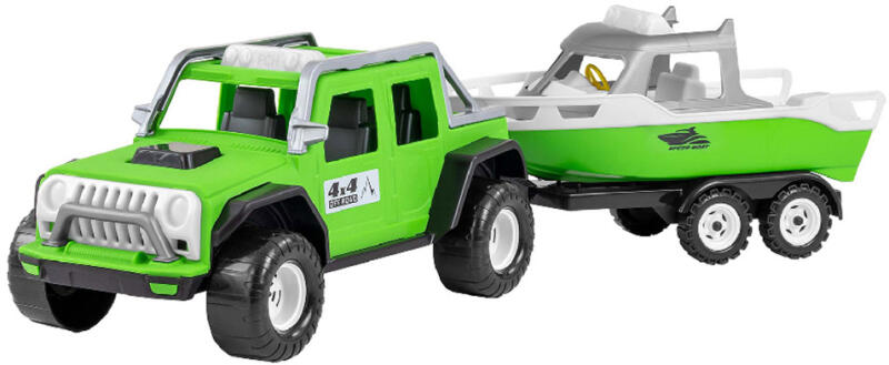 Két különálló játékot tartalmazó készlet. A modern színekben tündöklő terepjáró egy pótkocsira kötve húzza a motorcsónakot. A játékhoz zsinór rögzíthető, így a gyermek saját maga mögött húzhatja azt. Tulajdonságok: Utánfutós terepjáró motorcsónakkal - szín: narancssárga és zöld - anyaga: minőségi műanyag - képzelőerőt fejlesztő játék A termék szín