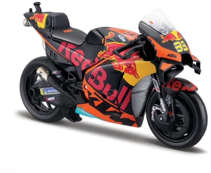 Red Bull KTM Factory Racing 2021.1:18 méretarányú motorkerékpár modell műanyag és fém alkatrészekből. Főbb jellemzők és specifikációk: Átlátszó fóliával ellátott kartondobozba csomagolva. Forgatható kormánykerék Felfüggesztett hátsó villa Véletlenszerű választás a #33Brad Binder és a #88 Miguel Oliveira között. Csomag mérete: 17,1x10,5x7cm. 3+ korosztály szám