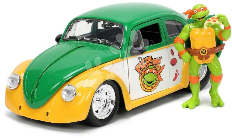 A Tini Nindzsa Teknőcök képregény motívummal ellátott Volkswagen Drag Beetle 1959 játékautó lelkes gyűjtőknek és gyerekeknek 8 éves kortól ajánlott. A 19 cm-es fém játékautó valósághű modellje minden kisfiút elbűvöl, a csomagban Michelangelo fémfigurája is megtalálható. A jogdíjjal védett játékautó zöldes- sárga változatban nyitható ajtókkal, kapotával és k