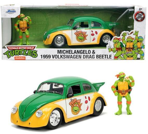 A Tini Ninja Teknőcök 1959 VW Drag Beetle fém autómodell figurával kifejezetten Michelangelo -nak, a bűnüldöző teknőccsapat felelőtlen és kalandvágyó mókamesterének készült. A kultikus jármű letisztult vonalakkal, ikonikus logókkal és matricákkal rendelkezik, ajtaja, motorház teteje és csomagtartója is nyitható. A részletesen kidolgozott belső tér is hozzájárul a Vo