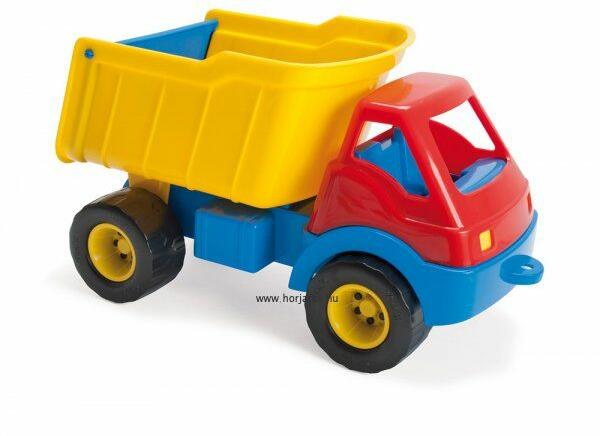 Ennek a teherautónak stabil, strapabíró kerekei vannak, ezért a homokozóban is bátran használható. Homokvárat építésénél jó segítség lesz. Mint egy igazi dömpernél, a hátulja ennek is billenthető, így a terhet könnyen ki lehet belőle önteni. Tartós, erős műanyagból készült, óvodák számára fejlesztették ki, teherbírását tesztelték, így az otthoni használatb