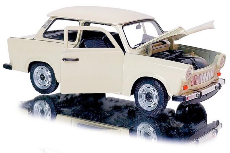 Mérete 15 cm (1:24 méretarány). Fémből készült a karosszéria, mely rendkívül részletgazdag: tökéletesen visszaadja a 601-es Trabant minden tipikus ismertetőjegyét. Nyithatók az ajtók, és a motorháztető is, mely alatt látványosan, részletgazdagon kialakításra került a 601-es kétütemű motorja is. Garancia (fogyasztóknak): 6 hónap Számos fajta 2T Trabant modellautó va