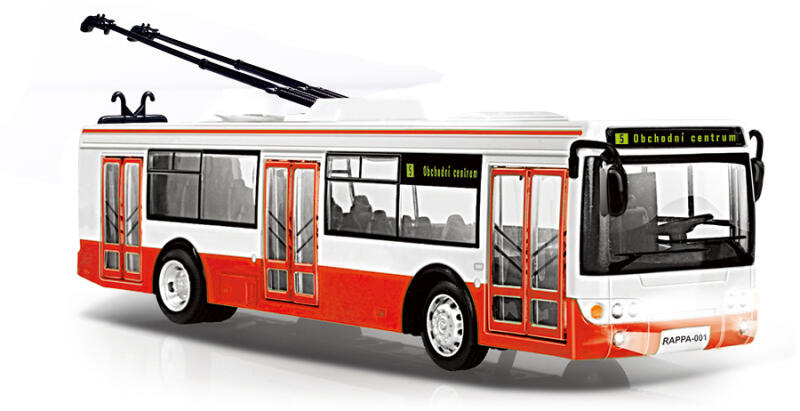 Ez a szenzációs trolibusz az állomásokat csehül jelenti be és lendkerékkel megy. Az ajtók manuálisan nyithatók és zárhatók a jármű tetején található gomb segítségével. Minden nyitásnál bemondja a megállót és a jármű fényszórói is villognak, amikor bezárja az ajtókat. A trolibusz 28 cm-es, műanyagból készült és a 3 mellékelt elem kell a használatához.