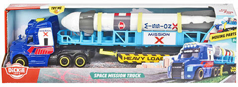 A Dickie Heavy Load Űrrakéta szállító játék kamion - 41 cm egy szuper járgány a kis űrlovagoknak! A menő, kék Mack kamionhoz tartozik egy levehető pótkocsi hevederekkel, melyen az űrbéli küldetéshez szükséges rakétákat tudja biztonságosan szállítani. A szabadon futó kerekekkel rendelkező kamion tetején található gombot megnyomva fények és hangok játéka teszi még