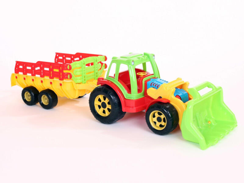 Ez a komplett készlet egy rakodós traktorból és egy kéttengelyes pótkocsiból áll. A pótkocsi oldalán korlátok találhatóak, ezzel megakadályozva az értékes rakomány elvesztését. Traktor pótkocsival és rakodógéppel (305) Tulajdonságok: - hossza: 90 cm - szélessége: 26 cm - magassága: 23 cm - anyaga: minőségi műanyag - finom motorikus mozgást fejlesztő játék A termé