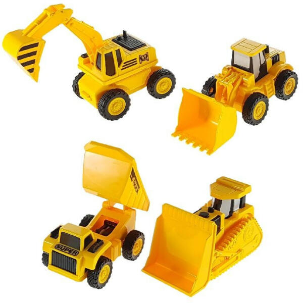 Munkagép szett, 4 db/csomag, 3 éves kor felett. Végezd el a munkát villámgyorsan, új munkagépeid segítségével. Anyaga: műanyag Tartalma: 4 db munkagép Mérete: 9 cm (dömper hossza)