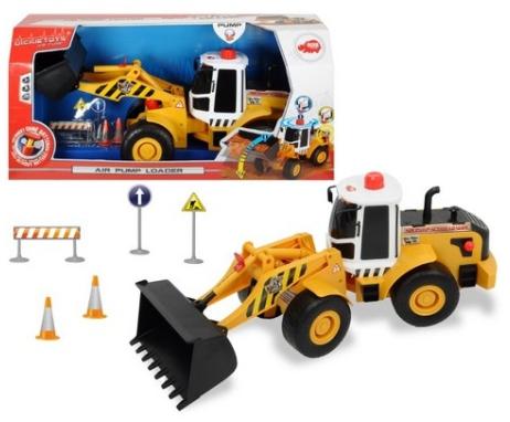 Megérkezett az óriás Dickie Játék levegőpumpás homlokrakodó (3809004) építkezéshez, útépítéshez. A nagyméretű játék munkagép tetején lévő gombot pumpáló mozdulatokkal nyomkodva megemelkedik a kanál, melyet a jármű oldalán lévő karral lehet leengedni. Az óriás játék homlokrakodóhoz 5 db kiegészítő is tartozik: az útépítésnél használatos figyelmeztető é