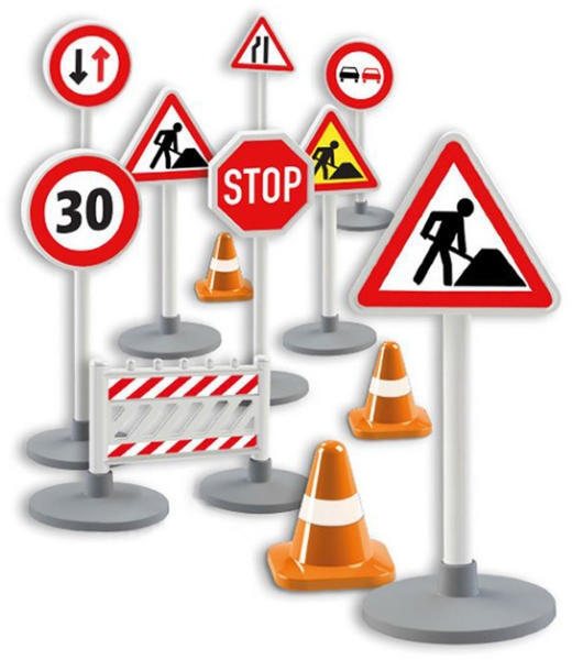 Ha már bőven rendelkezel minden féle járgánnyal, akkor épp itt az ideje, hogy beszerezz néhány közlekedési táblát, amivel szabályozni tudod a forgalmat az építési terület környékén. Ebben a készletben minden szükséges tábla megtalálható a sebességkorlátozástól kezdve, a munkavégzésre figyelmeztető táblákon át a megállító STOP tábláig, valamit a terelőbój