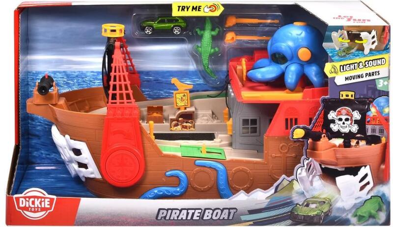 A Dickie - Kalóz hajó 41 cm Dickie kalózhajója tökéletes ajándék a hajók és autók kicsi és nagy rajongóinak, mert mindkettőt egyesíti! És van egy veszélyes polip is. Ez jó feszültséget szül. A színes dizájnnak és a számos funkciónak köszönhetően a hajó nem csak jól néz ki, de hosszan tartó szórakozást is biztosít a gyerekeknek. A fény és a hang a kalózhajóba