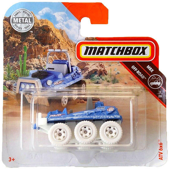 Matchbox: ATV 6x6 kék kisautó 1/64 - Mattel Hivatalos magyarországi forgalmazótól. Leírás: Az ATV 6x6 egy olyan egyszemélyes kis járgány, ami a hat kerék meghajtásnak köszönhetően minden féle tereppel képes megmegbízni. Ez a kék kis járgány fel van szerelve mindennel, ami a egy elhagyatott terület meghódítása során jól jön a felfedező számára. Az ásó és a tartalé