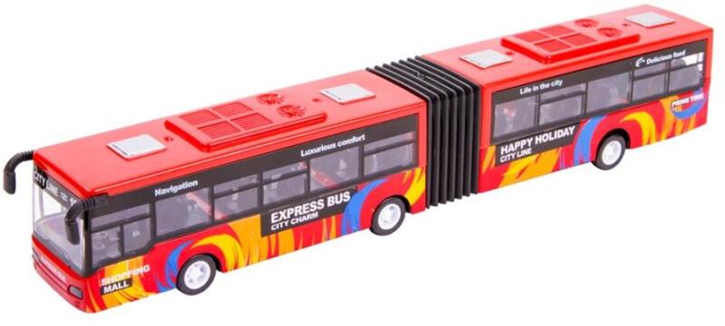 A részletesen kidolgozott, fémből és műanyagból készült csuklós játékbusz a járműrajongó apróságok kedvence lehet. 28 cm-es nagyságával igazi óriásnak számít, ráadásul gombnyomásra fény- és hanghatásokkal szórakoztatja „vezetőjét. 1:32 méretarányú, gyönyörű fényezéssel és strapabíró kivitellel. Működéséhez 3 db LR44-es elem szükséges, melyet a csom