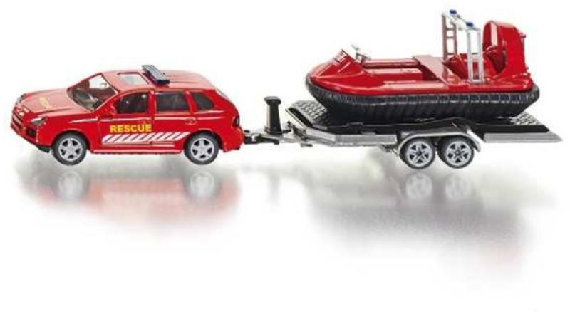 Vidd a partra a légpárnás motorcsónakot! A Siku: Tűzoltó autó légpárnással - 2549 készletben egy 1:55 méretarányú, tűzpiros Porsche Cayenne Turbo fém kisautót, egy utánfutót és egy piros csónakot találsz, amit a tűzoltók használnak. Az autó ajtajai nyithatók, a csónakot le tudod eresztetni a vízre, az utánfutót le tudod kapcsolni a terepjáróról. A játék együtt