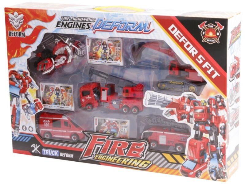 Változtasd át robottá a tűzoltó járműveket! Az Átalakuló autó 5 az 1-ben készlet egy műanyagból készült motort, furgont, daruskocsit, létrás autót és markolót tartalmaz, a tűzoltóság színeiben. Az autókat át tudod hajtogatni robottá, a kártyákon láthatod, hogy mi lesz a végeredmény a járművekből. A járművek élethűek, és együtt tudod használni őket más au
