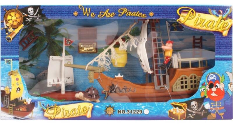 Szállj tengerre és fosztogass a kalózokkal! A Műanyag kalózhajó figurákkal a fiatal kalózok számára készült! A hajó orrát egy árboc és egy ijesztő fej díszíti, a vitorlán félelmetes minta ijesztgetik a békés hajósokat. Forgasd el a hajó kormányát, ha szeretnél irányt változtatni, az ágyúkkal bármilyen erős hadihajót el tudsz süllyeszteni. Csatlakozz a kincskeres