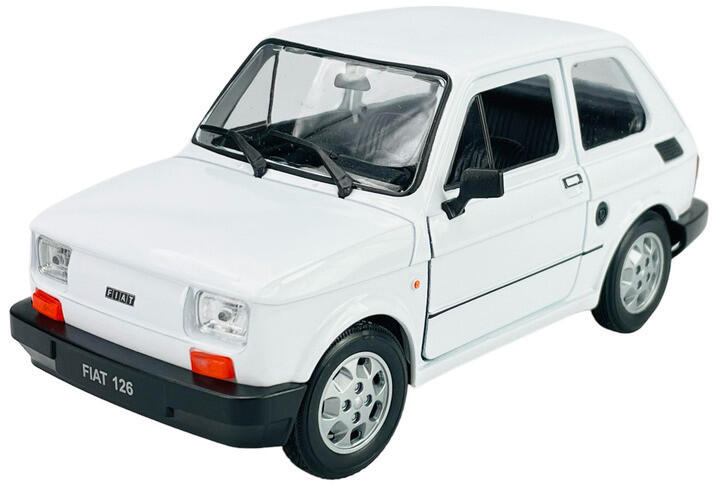 Fémautó Fiat 1:24 /126 szabad kerék Egy fehér színű Fiat 124/126 modellautót tartalmaz, amely 1:24-es méretarányban készült. A fémautó szabadon forogható kerekekkel rendelkezik, és részletesen kidolgozott belső és külső részekkel. A fémautó ideális ajándék lehet a Fiat rajongóknak, vagy akik szeretik a modellautókat. A fémautó mérete: 16 x 6 x 5 cm. A doboz mérete 2