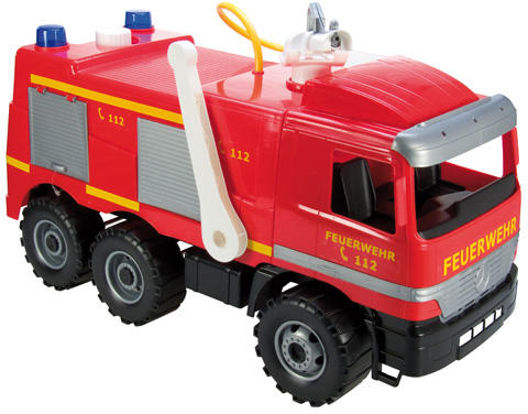 Óriás tűzoltóautó működő fecskendővel – 64 cm-es Mercedes Actros modell Az Óriás tűzoltóautó tökéletes választás minden kis tűzoltó számára! A Mercedes Actros modell élethű funkciókkal rendelkezik, beleértve a teljesen működőképes vízágyút és a 1,6 literes víztartályt, amely akár 8 méteres hatótávval permetez vizet. A tűzoltó fecskendő 360°-ban elforga