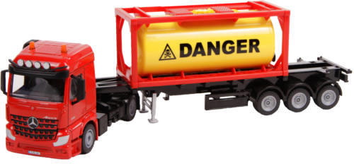 Szállítsd a veszélyes tartályt Mercedes-Benz kamionnal! A fémből és műanyagból készült piros Siku: Mercedes-Benz kamion rakománnyal 1:50 - 3922 járgány egy veszélyes anyagot szállító járműszerelvény, levehető tartállyal, lekapcsolható utánfutóval. Az utánfutót lábakkal tudod kitámasztani, a kamion részletes kidolgozottsággal készült. A játék együtt használhat