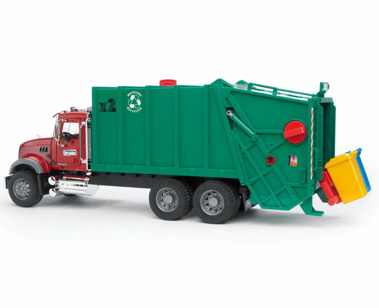 Bruder MACK Granite szemeteskocsi vezetőfülke: - összecsukható külső tükör - lehetőség megtekinteni a motorblokk - ajtók nyithatók futómű: - futófelület gumiabroncsok mozgás / funkció: - hulladék lehet billentette ki kilincs - forgőkerék mechanizmus lehetővé teszi a be- és kirakodás folyamat - dönthető szemétgyűjtő Megnyitható További információk: - Szerelje be a
