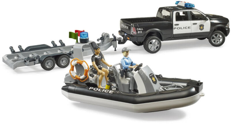 A Bruder 02507 Rendőrségi RAM pótkocsival, csónakkal és jelzőfénnyel játékcsomag új terepet nyithat a rendőrös szerepjátékok és a bűnüldözés világában, ugyanis a vagány rendőrjármű elszállíthatja a csónakot, hogy az ugyancsak mellékelt rendőr-, illetve búvárfigura a vízen is bevethesse bátorságát és lefülelhesse a rosszfiúkat. A vagány helyzetek megteremtés
