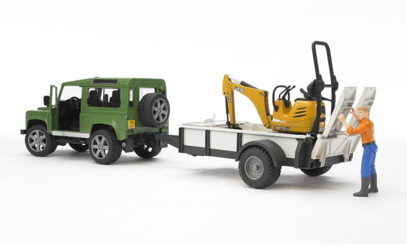 Bruder Land Rover Defender utánfutóval és JCB 8010 CTS markolóval gépjármű karosszéria: - a hátsó ajtóhoz rögzített pótkerék - levehető hátsó ülés - a motorháztető kinyitható alváz: - rugós elülső és hátsó tengelyek 4 acél húrral - beleértve a szelepet. kivehető vonórúd-csatlakozás További információk: - Merev vonórúd pótkocsi hátsó ajtóval, amely kiny