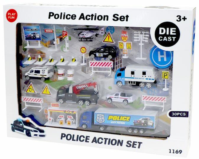 Ezzel a nagy rendőrségi játékszettel igazi rendőr lehetsz. A 30 darabos készletben minden megtalálható kezdve a rendőrségi autótól, a táblákig és még egy helikopter is. Használjatok ki minden eszközt a mentéshez! A játékot 3 éves kortól ajánljuk. Anyaguk: műanyag és fém.