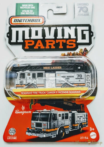 A Matchbox Moving Parts szériájában élethű, mozgatható alkatrészekkel rendelkező kisautókkal bővíthetik gyűjteményüket a Matchboxok szerelmesei. A kollekció olyan népszerű világmárkák karosszériáit tartalmazza, mint a Ford, a GM, a Volkswagen vagy a Nissan. Ebben a csomagban egy Seagrave Fire Truck kisautó található, amelynek létrája mozgatható. A kollekció fém elemek