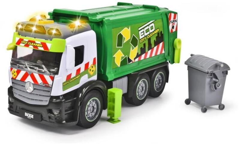 A legújabb Dickie Action Truck játék kukásautó - 26 cm segítségével a város tisztán tartása nem lesz nehéz feladat! A Mercedes márkájú járgány tetején lévő gomb megnyomásakor hallhatjuk az induló jármű hangját, a fülke tetején lévő lámpák pedig villognak. A jármű tartálya billenthető és ha sok szemét van benne, le is lehet talpalni, amivel stabilabbá tehető a