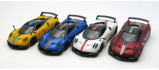 Kinsmart Pagani Huayra BC Mérete:12 x 5 x 4 cm. A Kinsmart Pagani Huayra BC autó különlegességet stílusos festés és részletes belső és külső kialakítás jellemzi. Az ajtók nyithatóak, az autó hátrahúzós mechanikával rendelkezik. A kisautó fém és műanyag felhasználásával készült.