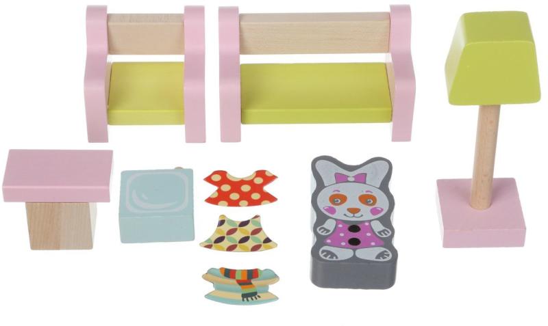 Fából készült bútorkészlet babákhoz "A nappali" mágneses kiegészítőkkel egy 9 darabos készlet, amely 6 fa elemet tartalmaz: kanapé, fotel, TV-asztal, TV, lámpa és figura, mágnesekkel, 3 mágneses ruhával. A Cubik játékok választéka mindenekelőtt az érzékszervi képességek és készségek, a logikai gondolkodás, a kreativitás, a képzelet és a különféle kognitív isme