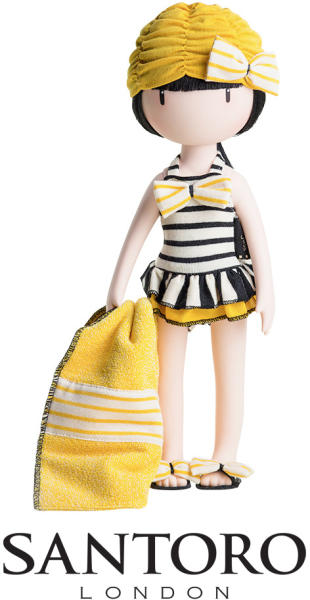 Játékbaba strand szett Santoro Gorjuss Megérkeztek a kiegészítő ruhák a 32 cm-es Santoro Gorjuss játékbabákhoz , strand szett formájában! A szett tartalmaz: egy pár fekete papucsot mustársárga-fehér színű, csíkos masnidíszítéssel egy mustársárga úszósapkát a fent említett masnidíszítéssel egy mustársárga alapszínű strandtörülközőt, aminek két oldalán fekete