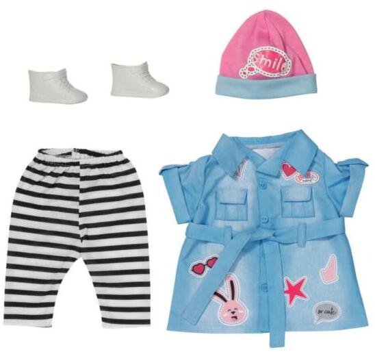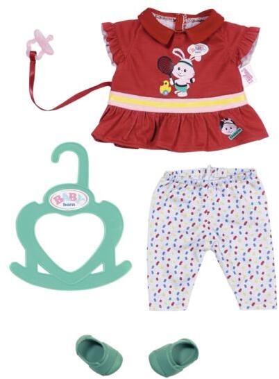 BABY born Little próbált teniszezni. Azóta gyakorolja a szolgálatot a ruhájára erősített próbabábuval. Ha túl feszült lesz a meccs, könnyen felszívhatja a bábuját. A Benno nyuszi és a Berta kacsa piros teniszruhákra van nyomtatva, melyek aranyos gallérral és fodros ujjakkal rendelkeznek. Zöld tornacipő és fehér nadrág színes konfetti pöttyökkel. A szett easy fit stílus