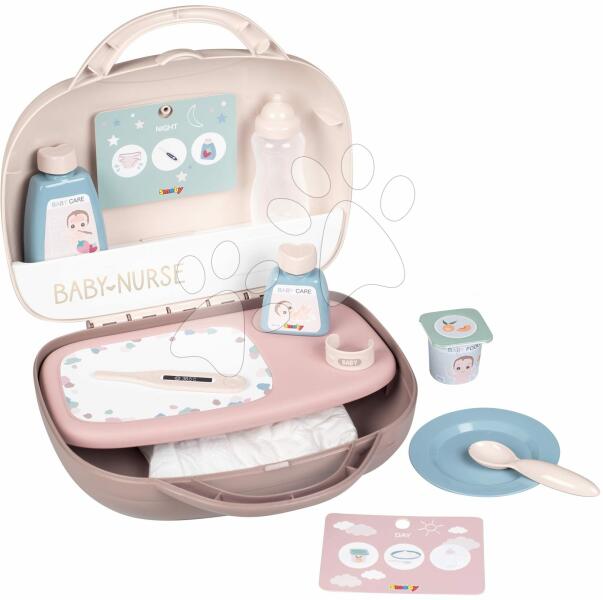 Pelenkázó szett bőröndben Vanity Natur D'Amour a népszerű Baby Nurse kollekcióból egy igazán közkedvelt és modern tartozék babázáshoz kislányok részére 3 éves kortól, akik nagy örömmel és lelkesedéssel gondoskodnak kedvenc játékbabájukról. A pelenkázó szett kompakt bőröndbe van csomagolva, mely csodaszép pasztell színárnyalatban pompázik. A koffert a kis dadus b