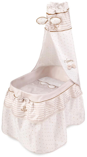 Verona Collection - mózeskosár játék babákhoz - DeCuevas Verona Collection - mózeskosár játék babákhoz. A DeCuevas Verona Kollekciójába tartozó csodaszép játék mózeskosár amellett, hogy a gyerekszobák dísze lehet, nagyszerű játéklehetőséget kínál a kislányok számára. A luxus kialakítású mózeskosár baldahinnal és a lábakat eltakaró fodros dísszel van ellátva.