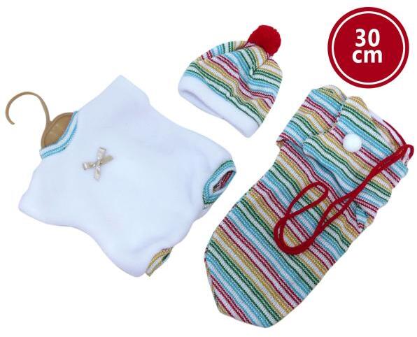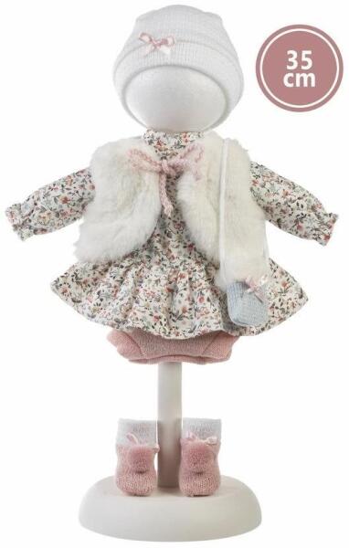 3 részes ruha, egy hordozható tépőzáras táskával egy 30 cm-es Llorens baba számára. Spanyolországban kézzel készített, műanyag pánttal ellátott műanyag zacskóba csomagolva. Ajánlott életkor 3 éves kortól.