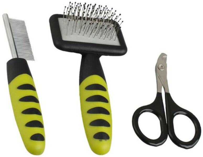 Ezzel a 3 az 1-ben ápolókészlettel puhán és fényesen tarthatod szőrös barátod bundáját. A sörték finoman íveltek így segítenek a csomók kibogozásában. A gumi markolat jobb fogást biztosít, a körömolló pedig rozsdamentes acélból készült, műanyag nyéllel. Anyaga: műanyag 3 az 1-ben: körömolló, univerzális kefe és ápolófésű Alkalmas kisméretű, rövid vagy hos