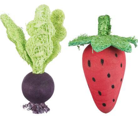 Trixie fa fogkoptató játék eper és cékla formában rágcsálóknak kapható kiegészítő felszerelés. 100% -ig természetes anyagokból készült. A játékok 6 illetve 9 cm-esek.