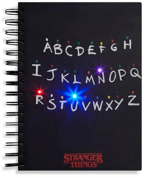 Világító Notebook A5 jegyzetfüzet - Stranger Things Világító Notebook A5 jegyzetfüzet. A Stranger Things sorozat első évadának ikonikus jelenete ihlette a füzet tervezőit. Az ötletes jegyzetfüzet borítóján lévő égősor három eleme még világít is, ha megnyomjuk a borító belső oldalán lévő gombot. A színes kis lámpákkal ugyan mi nem tudunk üzenni szeretteinknek, de
