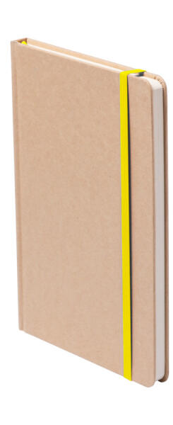 Újrahasznosított karton borítású jegyzetfüzet 100 sima lappal, megegyező színű könyvjelzővel és gumipánttal.
