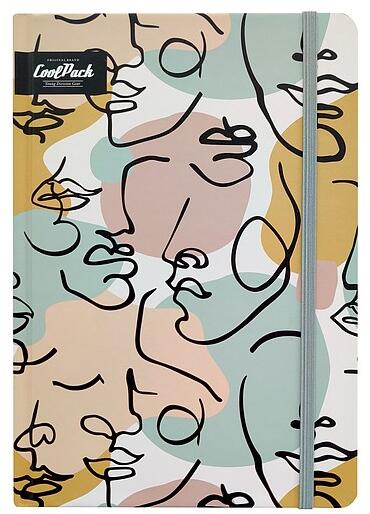 Stílusos jegyzetfüzet dizájnos borítóval. A lapos, tartós gumiszalag megvédi a jegyzetfüzetet a kinyílástól és megakadályozza a lapok sérülését. Praktikus méretének köszönhetően elfér a táskában. Lágy, színes háttéren ábrázolt, absztrakt arcformákból álló, szerény dizájn. Ez a mintázat más CoolPack terméknél is megtalálható, komplett kollekció kialakíth