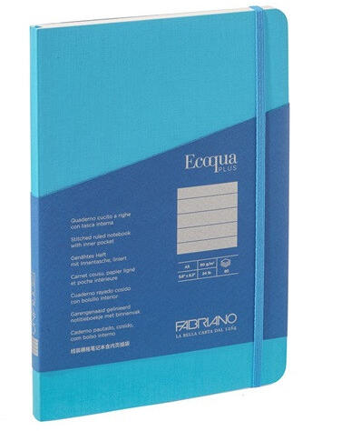 Fabriano Ecoqua Plus A5 80 lapos türkiz vonalas notesz Kiváló minőségű notesz, 8 féle színben; 80 lapos, cérnakötésű, mely 180°-os nyitást biztosít; 90 g vastagságú elefántcsont színű vonalas lapok; Belső tároló rekesz és könyvjelző szalag; Mérete: 14,8x21 cm; Certifikáció: FSC, TCF, ACID FREE, LONG-LIFE, HYDROPOWER