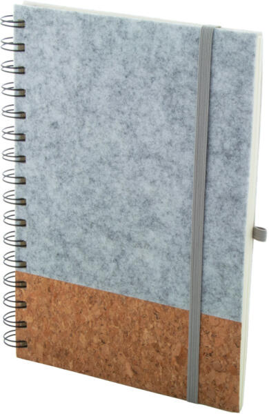 RPET filc és természetes parafa borítású jegyzetfüzet újrahasznosított papírból készült 70 vonalas lappal, gumipánttal és tolltartóval. A5 méretű.