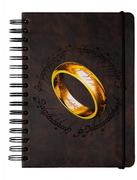 Spirál jegyzetfüzet A5 - Gyűrűk Ura Spirál jegyzetfüzet A5 - A Gyűrűk Ura történet inspirálta a jegyzetfüzet elegáns borítójának megalkotását. A sötétbarna alapszínt az arany színű gyűrű, valamint a hátoldal arany felirata töri meg. A borítók belső oldalán Középfölde térképei láthatók, szintén barnás árnyalatban. A belső lapok krémszínűek és apró pöt
