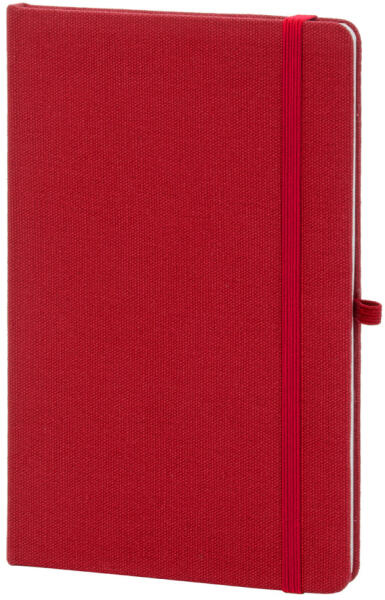 Újrahasznosított pamut borítású jegyzetfüzet 80 vonalas lappal, újrahasznosított papírból. Megegyező színű könyvjelzővel, gumiszalaggal és tolltartóval. A5 méretű.