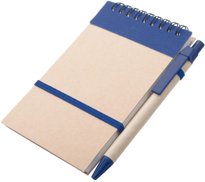 Újrahasznosított papírból készült spirál jegyzetfüzet 70 vonalas lappal, újrahasznosított karton golyóstollal. Kék tollbetéttel szállítjuk. A6 méretű.