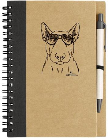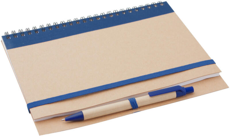 Újrahasznosított papírból készült spirálozott jegyzetfüzet 60 sima lappal, papír golyóstollal.