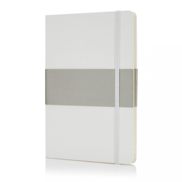 A5-ös méretű jegyzetfüzet illeszkedő színű gumipánttal és díszcsíkkal, lekerekített sarkokkal. 160 oldal (80 g/m2), vonalas, sárga lappal.