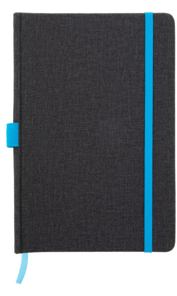 Műbőrrel borított jegyzetfüzet megegyező színű könyvjelzővel, gumiszalaggal és tolltartóval. 96 vonalas lappal, A5 méret.