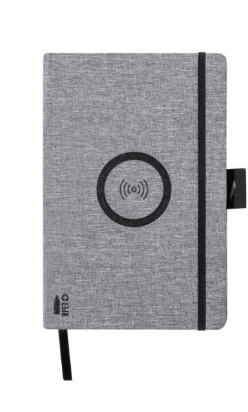 RPET poliészter vezeték nélküli töltős jegyzetfüzet (10W) 80 vonalas lappal, A5. USB töltőkábellel együtt szállítjuk. 300D RPET poliészter.