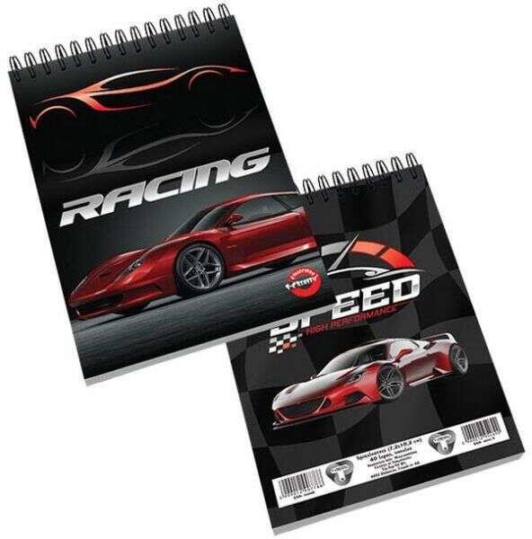 Kisméretű, A7-es vonalas jegyzettömb piros sportautós mintájú borítóval. A spirálos notesz 40 lapos. Hófehér lapok. A képen a jegyzettömb elején és hátoldalán található minta látható.