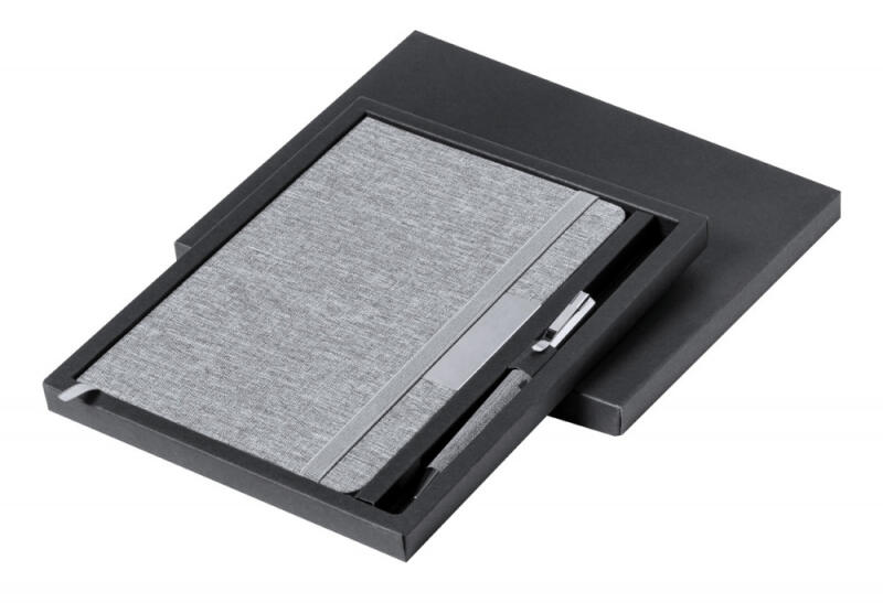 300D RPET poliészter borítású jegyzetfüzet 100 vonalas lappal és gumis pánttal. RPET poliészter borítású fém golyóstollal, kék tollbetéttel. A5 méretű.